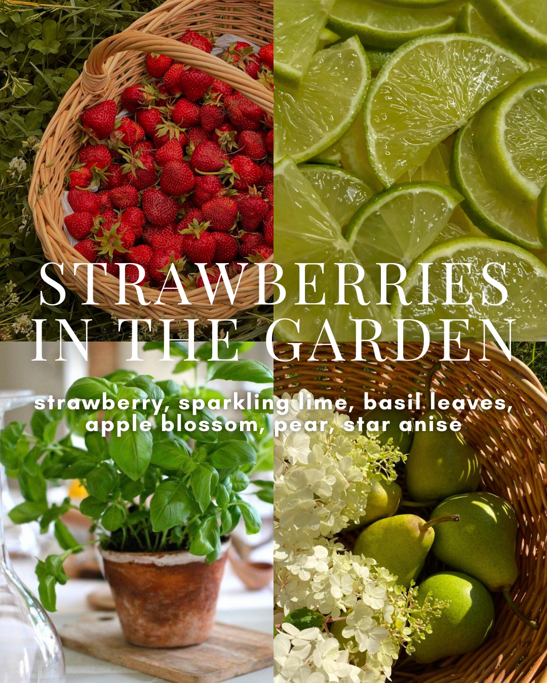 strawberry, sparkling lime, basil leaves, apple blossom, pear, star anise