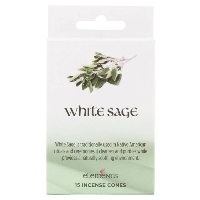 Scented White Sage incense cones. Each pack contains 15 incense cones. Comes with a small round metal cone holder.